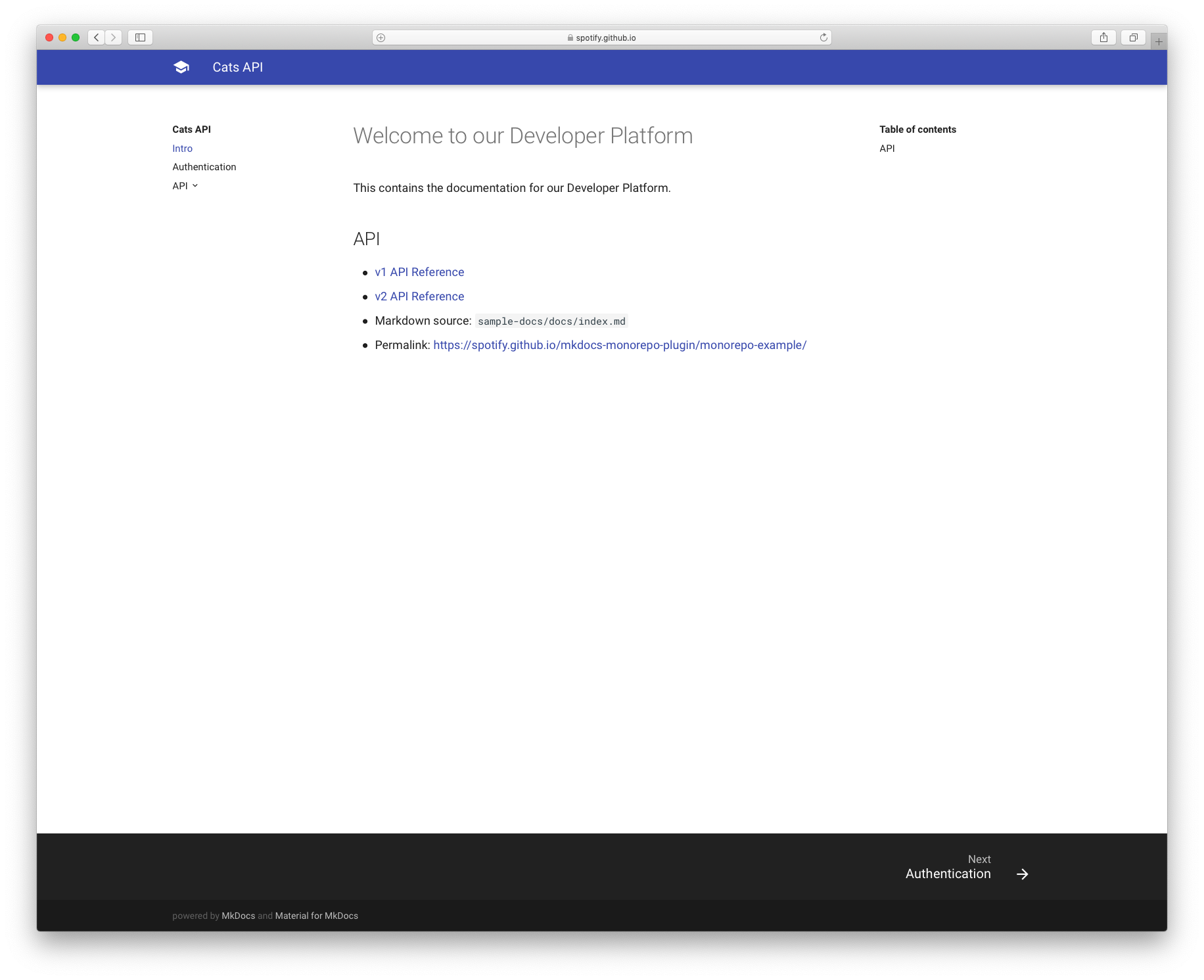 mkdocs.yml. This allows them to structure their documentation in a monorepo however they see fit and it will be centralized into a single documentation site.Leverages GitHub Codeowners for configuring multiple owners. Numerous squads at Spotify use GitHub Codeowners to assign “ownership” to different squads on a per-directory or per-file basis. We wanted to tap into this existing GitHub feature.